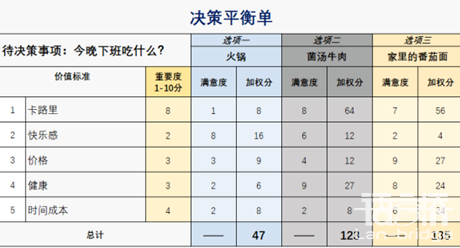 比如決策今晚下班吃什么,你既想要減肥,又想要好吃,還想要省錢,一頓飯得滿足多種需要,自己左右為難,內(nèi)心糾結(jié)。這時候一個決策平衡單,填入你的待選項,再填入你的需要(價值標準),標注好重要程度,就來打分,如下圖,就吃家里的番茄面吧!
