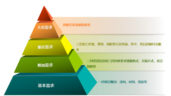 商業行為中的客戶的需求,概括起來就是“誰”在“什么環境下”想要“解決什么問題”。借助于馬斯洛需求層次理論模型進行延伸,我們可以通過深入對語言服務產品購買者,即我們的客戶的“需求”進行分析與歸類,將語言服務產品的購買者的需求劃歸為四類,即產品基本需求、產品附加需求、產品服務需求和關系需求。