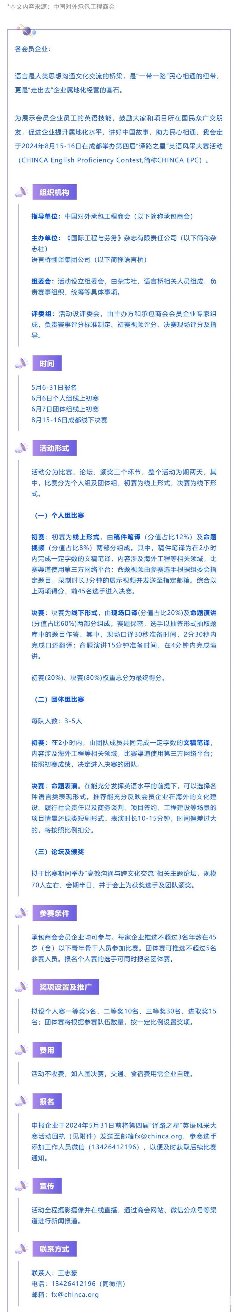 "由中國對外承包工程商會指導(dǎo),《國際工程與勞務(wù)》雜志有限責(zé)任公司、語言橋翻譯集團(tuán)公司主辦,第二屆“譯路之星”英語風(fēng)采大賽活動(“CHINCA”English Proficiency Contest,簡稱CHINCA EPC)決"...[查看更多]