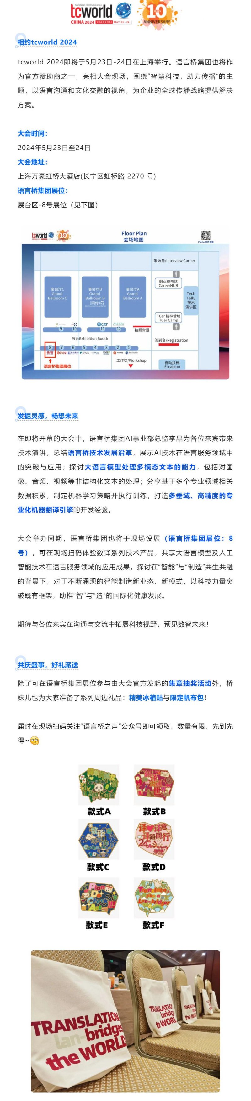 " tcworld 2024即將于5月23日-24日在上海舉行。語言橋也將作為官方贊助商之一亮相大會現場,圍繞“智慧科技,助力傳播”的主題,以語言溝通和文化交融的視角為企業的國際傳播獻計"...[查看更多]