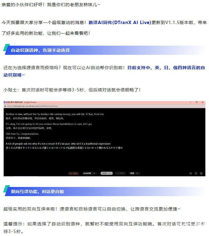 "數(shù)譯A同傳又雙叒愛更新啦!上周四我們發(fā)布了最新的V1.1.4版本。本次更新帶來(lái)了多項(xiàng)實(shí)用功能,讓橋妹兒帶大家一起來(lái)看看吧~ "...[查看更多]